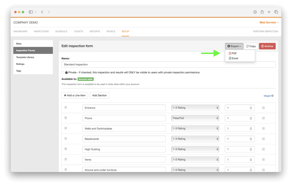 Admins can export blank copies of inspection templates, either as PDF or Excel files. Here’s how: